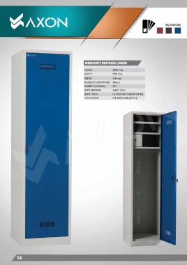 EMERGENCY RESPONSE LOCKER HEIGHT 1900 mm. WIDTH 500 mm. DEPTH 500 mm. NUMBER OF COMPARTMENT SINGLE DEGREE OF OPENING 135 BODY MATERIAL SHEET STEEL BODY FINISH ELECTROSTATIC POWDER COATING LOCK SYSTEM CYLINDER LOCK (LATCH) 14 14